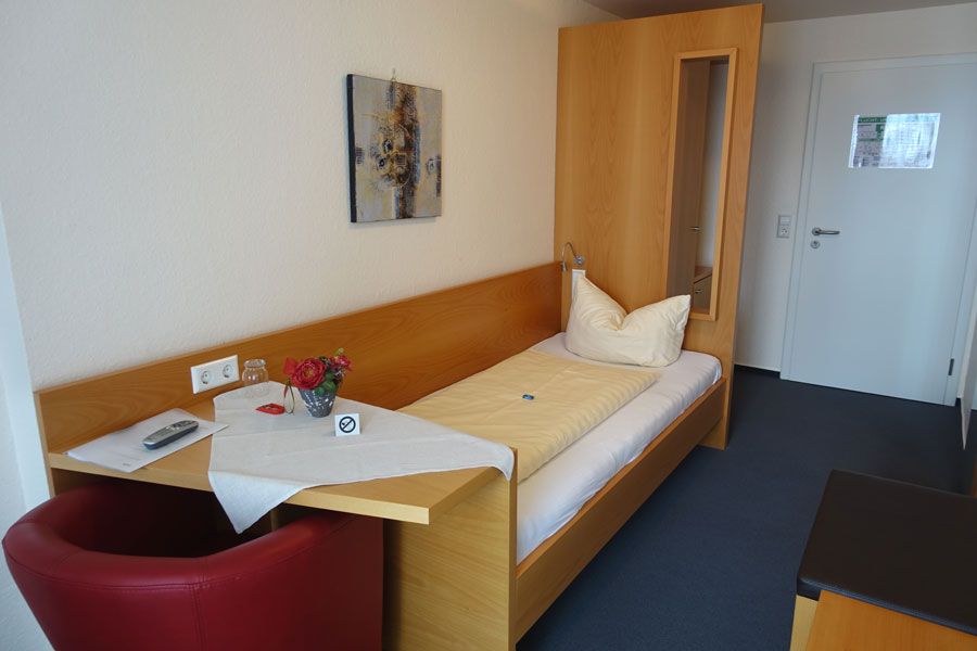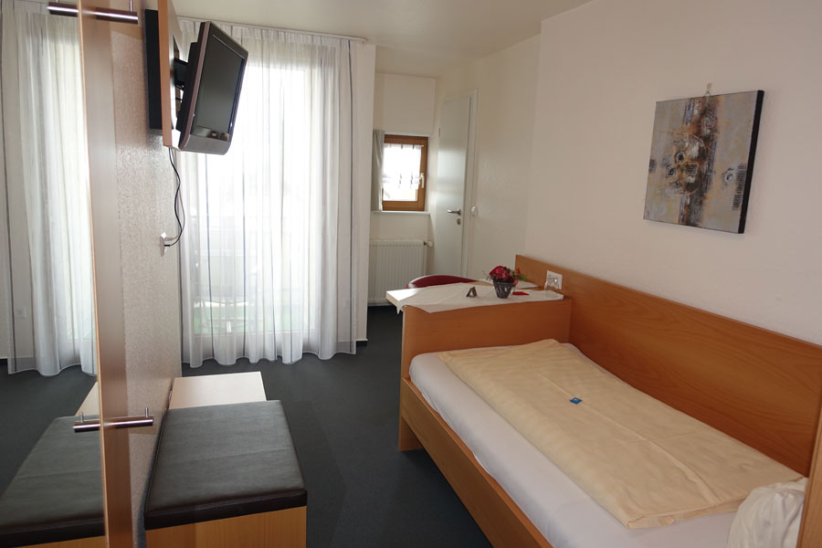 Unsere Einzelzimmer (mit oder ohne Balkon) verfügen über Dusche/WC, Fön, Kühlschrank, Safe und SAT-TV, haben eine Wohnfläche von ca. 12 qm und sind für 1 Person geeignet. ⇒ 360° Rundgang